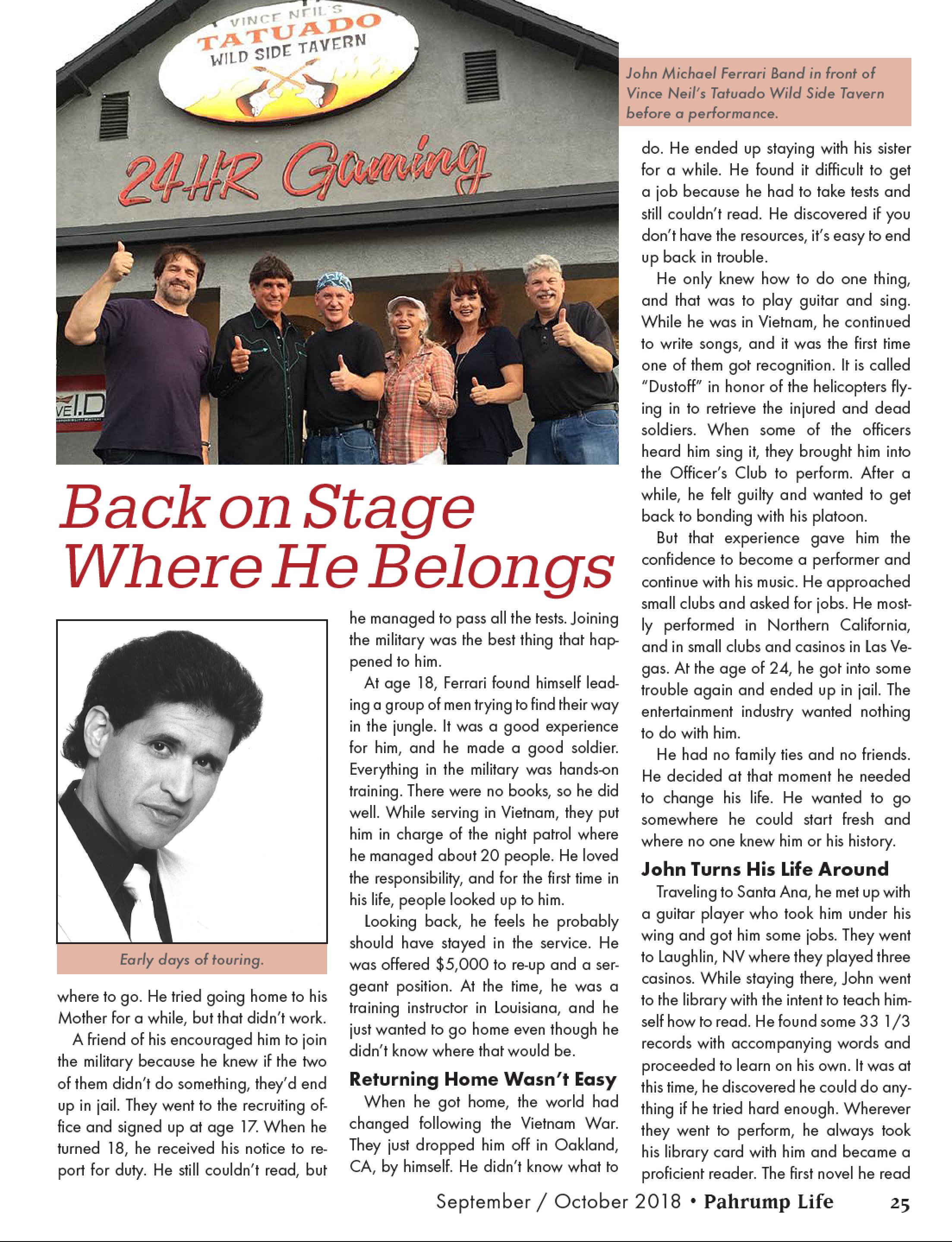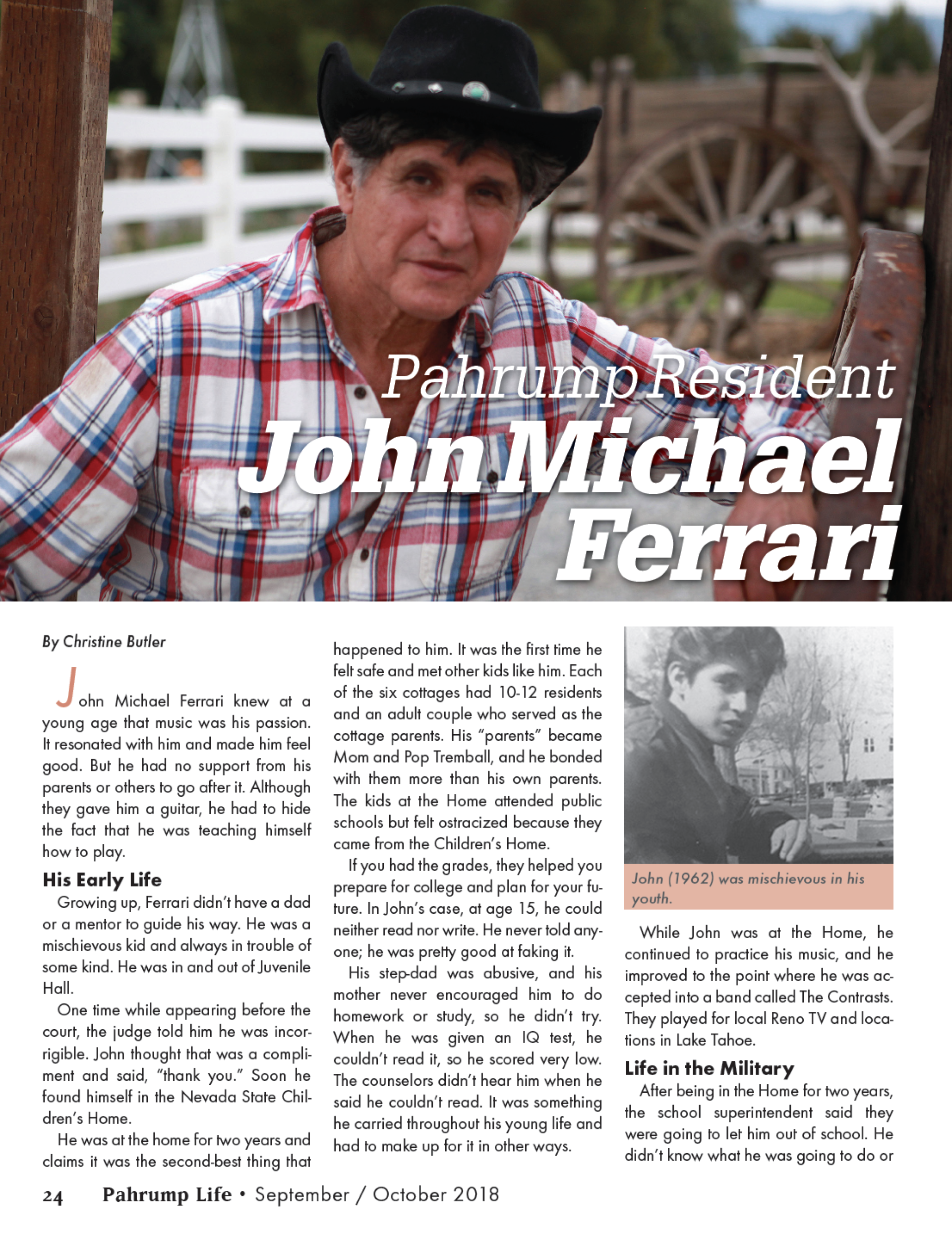 Pahrump Life Magazine runs a 4 page story on singer songwriter John Michael Ferrari entitled, John Michael Ferrari Back on Stage Where He Belongs. John shares his original alt country songs about his experiences and the experiences of others. Lyrics, melody, and arrangements by John Michael Ferrari. Produced by Pepper Jay / Pepper Jay Productions